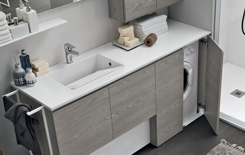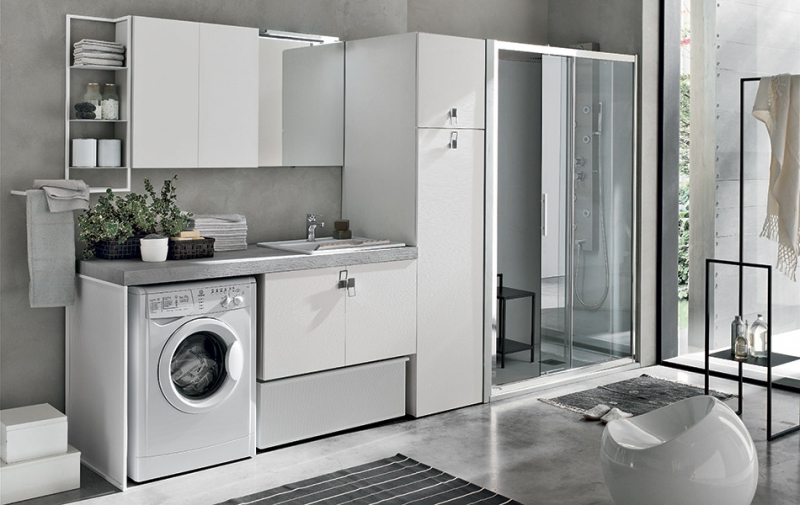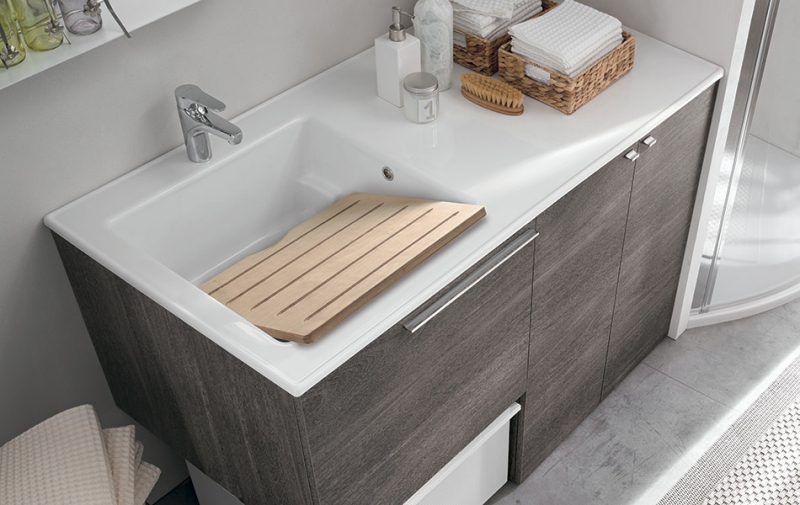 Un fianco di raccordo unisce l’arredo con zona di lavaggio a mano, moduli porta lavatrice e asciugatrice, accessori anche in metallo e contenitori attrezzati al box doccia rettangolare o raggiato in soluzioni pratiche e salvaspazio. La grande gamma di finiture, dai laccati all’Ecomalta, dalle essenze alle finiture speciali, permette di coordinare la lavanderia allo stile della casa