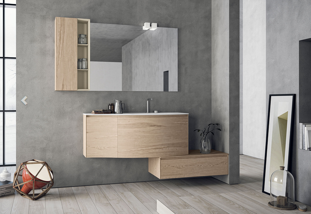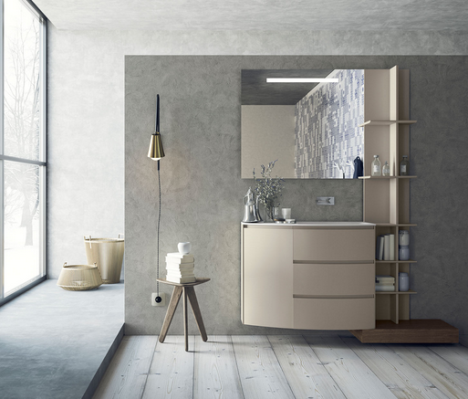 Calix è un prodotto che unisce la cura per il dettaglio ad un design essenziale: esso si compone di elementi stereometrici dalle linee semplici ottenute mediante l’accurata giustapposizione di pannelli dagli spessori esili o rastremati che permettono di apprezzare i volumi nella loro interezza smaterializzandone i bordi. Questa nitidezza formale è conferita tra le altre cose dall’utilizzo dell’anta a gola con profilo inclinato chiusa dal tamponamento laterale formato da pannelli da 8 millimetri di spessore, nonché da vani a giorno culminanti anch’essi con bordi inclinati. Proposto anche in una versione ad anta curva esso si adatta a molteplici configurazioni di utilizzo ed è sufficientemente versatile da trovare spazio all’interno di diverse tipologie abitative. Calix come calice, forma alla quale si ispirano le silhouette dei lavabi da appoggio che si distinguono per il bordo che si apre verso l’esterno e ricordano la forma di un tulipano. Presentato in due differenti altezze, il lavabo si contrappone alla linearità dei vani sottostanti mitigandone le forme. Oltre ai lavabi d’appoggio viene anche proposto un modello ad incasso caratterizzato da due sponde laterali che scendono dolcemente verso il catino. A corredo del programma vengono affiancati una serie di accessori che comprendono tra le altre cose dei vani a giorno in lamiera laccata che fanno pendant con specchi composti da una cornice in lamiera ripiegata alle due estremità per formare due vani che ospitano rispettivamente una luce led nella parte superiore ed una mensola nella parte inferiore. Il programma viene proposto in una serie di nuove finiture che comprendono dei laminati HPL unicolor con decorativi che spaziano dal rovere con effetto vintage alla pietra e si accompagnano ad un’ampia scelta di laccature che mirano a creare un programma completo in grado di accontentare un’ampia gamma di utenti e tipologie spaziali.