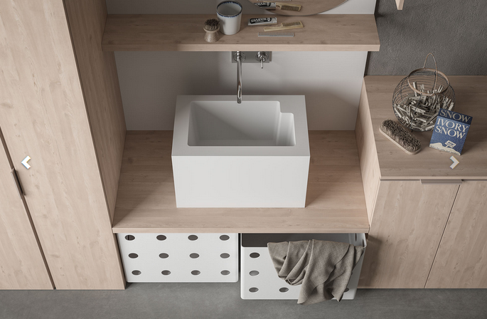 Le vasche personalizzate vengono proposte nelle profondità 65 e 38 cm. e un’ampia serie di accessori rende il programma ancora più razionale e divertente: cestoni portabiancheria in alluminio su ruote, pensili con ripiani e tubi appendiabiti o mini stendiabiti, vani a giorno, mensole riposizionabili e specchi multifunzione. La ricca gamma di attrezzature interne disponibili per le basi e per le colonne risponde anche alle esigenze più sofisticate.