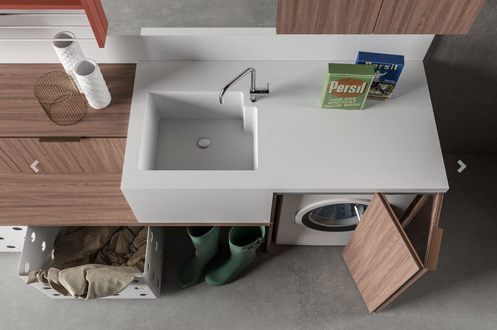 Ora anche gli ambienti più “umili “ della casa sono in grado di offrire ogni giorno emozione e comfort con una qualità che dura nel tempo e con un design che non passa di moda. Gli arredi sono disponibili secondo una vasta modularità di colonne, basi e pensili declinati in altrettante molteplici finiture sia con effetto legno che laccate in vari colori. Tenendo presenti le esigenze pratiche di lavoro e di spazio, le ante delle colonne e delle basi, vengono proposte sia con apertura a battente che a libro. Un particolare profilo maniglia a bordo anta caratterizza il programma che pur mirando alla praticità più estrema non trascura l’attenzione al dettaglio e allo stile.