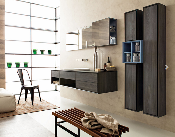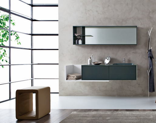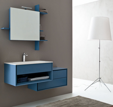 Un programma per la zona bagno ampio, poliedrico e multiforme che vede nella libertà compositiva la sua grande forza espressiva. Il programma ha una sua semplice grammatica: una serie di contenitori aggregabili a piacere tra loro in forme simmetriche, o per contrasto, asimmetriche. Forme semplici, spessori sottili: i contenitori possono essere laccati (Scegliendo tra l’ampia gamma cromatica a disposizione), lucidi oppure opachi, oppure realizzati in HPL nelle finiture “olmo bianco”- “olmo grigio” e “olmo beige”. L’insieme dei moduli è racchiuso da un perimetro con bordo a 45° che sottolinea con garbo la composizione; L’apertura dei frontali avviene con sistema push-pull. I contenitori si accompagnano a “colonne” in varie dimensioni; esse possono essere completate da elementi a giorno che ne esaltano l’espressività, modulandosi in composizioni formalmente assai gradevoli, e funzionali nell’uso, e adatte allo sfruttamento dei piccoli angoli. Su tutte le composizioni si impone il caratteristiche lavello realizzato in “teknorit” bianco opaco: un bacino molto ampio e capiente, pratico nell’uso, minimale nella forma. La sua caratteristica è quella di esser contornato da una specie di rialzo, di colletto dalle forme morbide e arrotondate. Esso può essere inglobato nel piano top in un’unico blocco stampato, ma esiste anche la soluzione a sbalzo, particolarmente adatta per i contenitori a profondità ridotta (37cm) e quindi a bagni ove è importante la “conquista del centimetro”. Il caratteristico lavabo con il bordo rialzato “a colletto” esiste anche integrato in un top del medesimo materiale Teknorit ma nella finitura “Ardesia” nei colori grigio scuro e bianco. In alternativo al piano in Teknorit, sono disponibili altre tipologie di lavabi come: